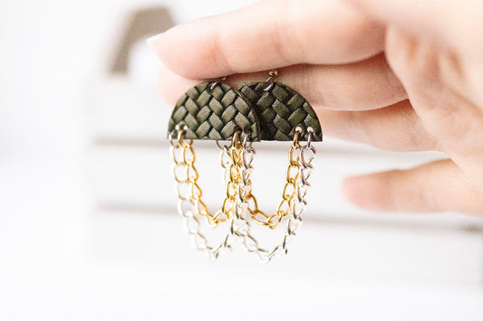 Leather Earrings / Chain Drop / Houndstooth Cork