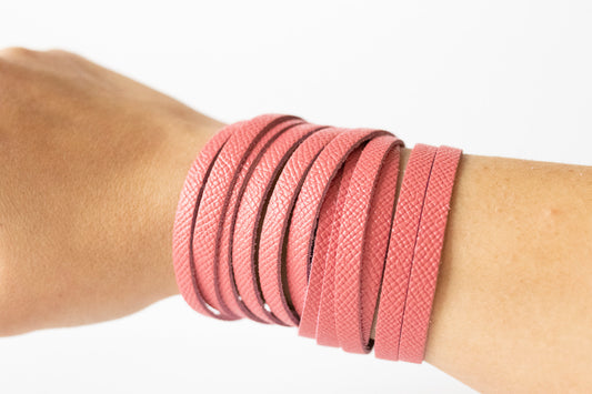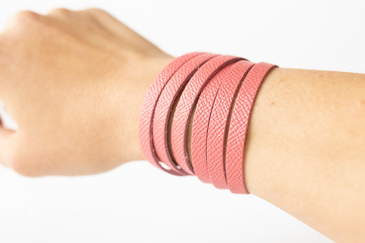 Leather Bracelet / Skinny Sliced Wrap Cuff / Pink Cherries