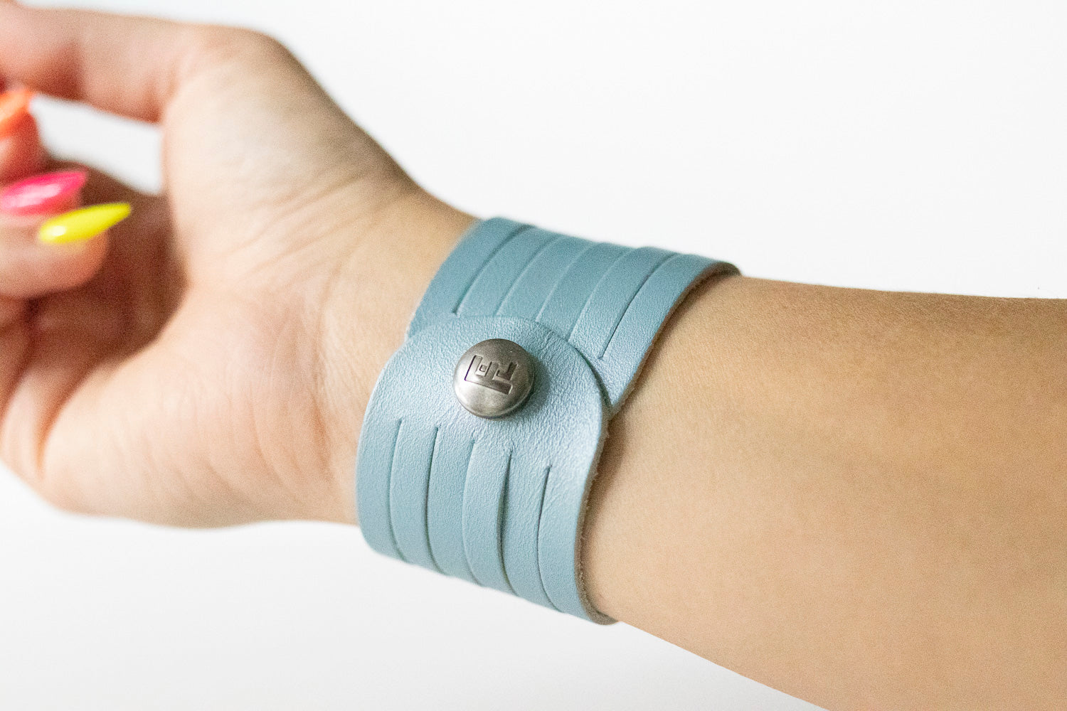 These bracelets will come with a brushed silver FL (Flourish Leather) logo snap.