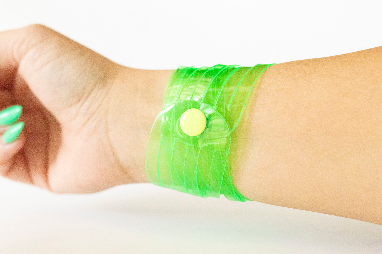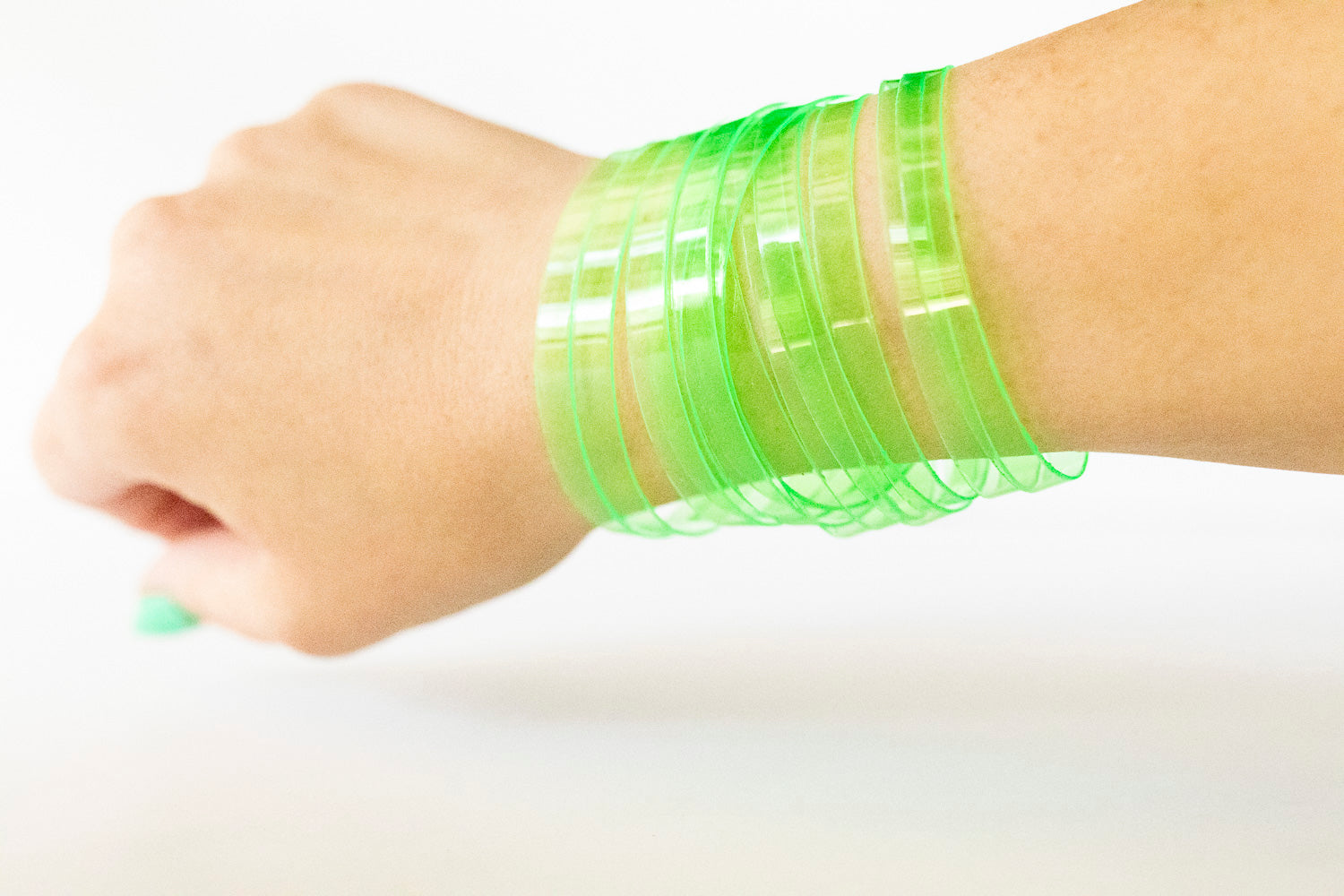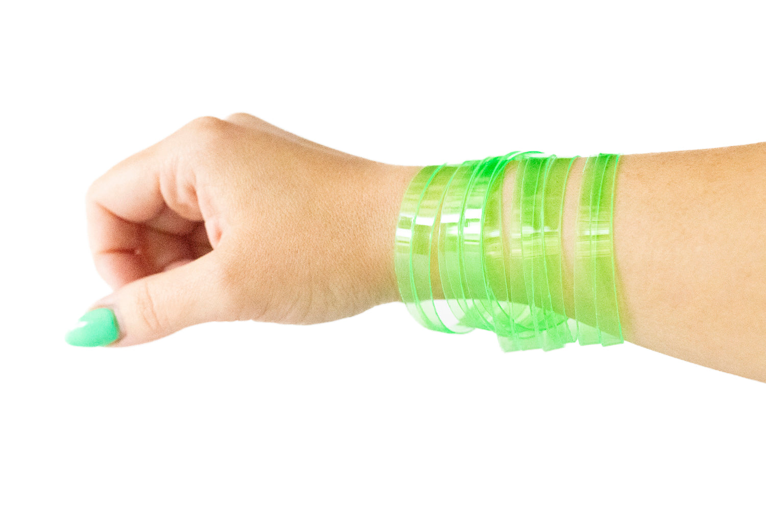 This bracelet is 100% genuine jelly vinyl. Handmade and hand-cut.