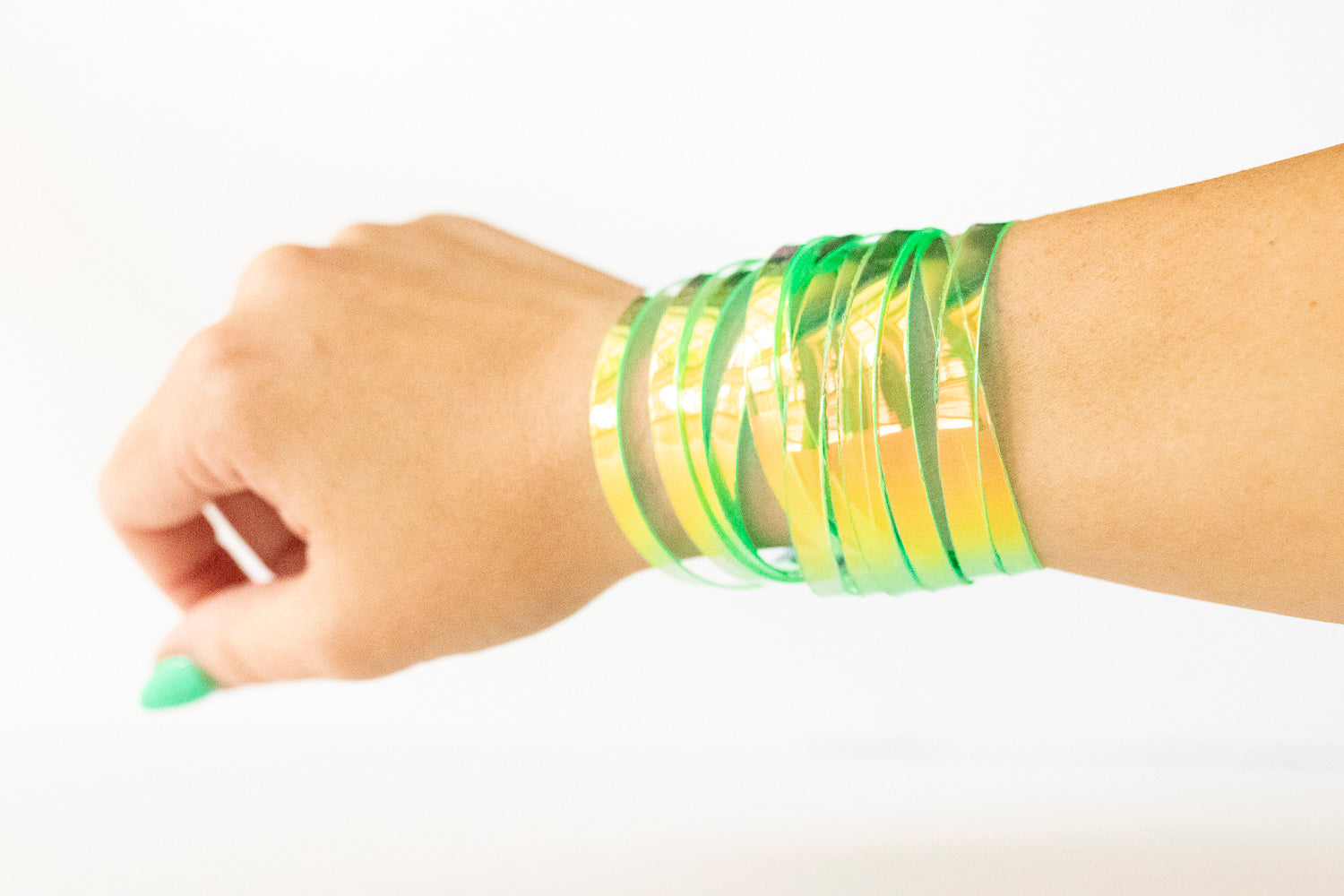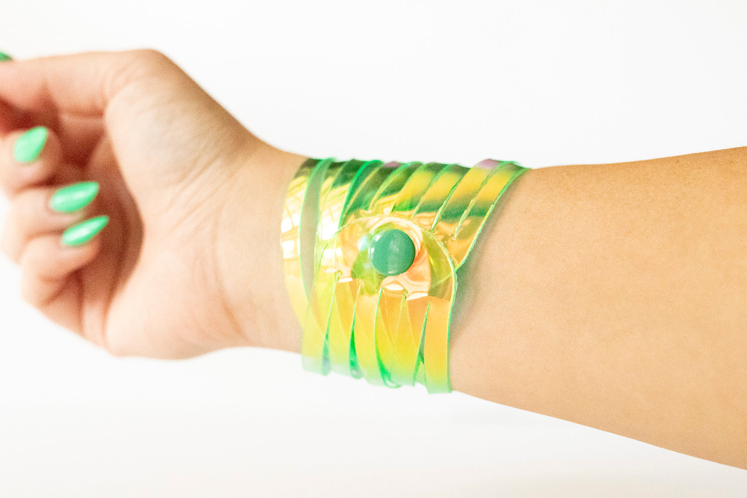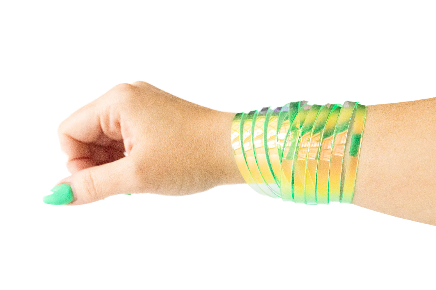 This bracelet is 100% genuine jelly vinyl. Handmade and hand-cut.
