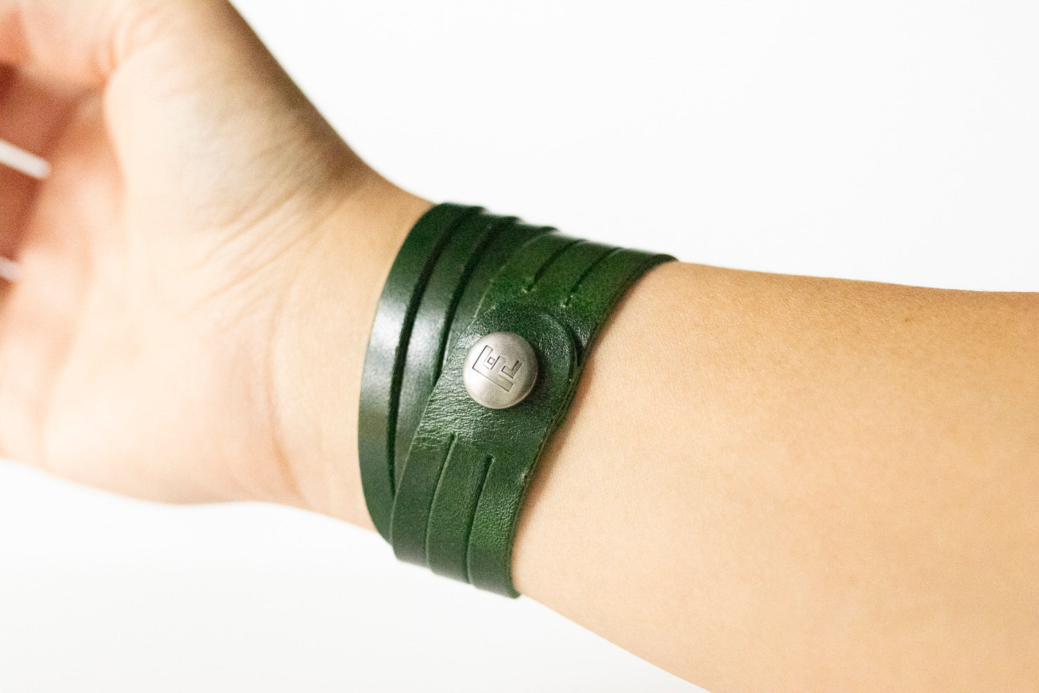 These bracelets will come with a brushed silver FL (Flourish Leather) logo snap.