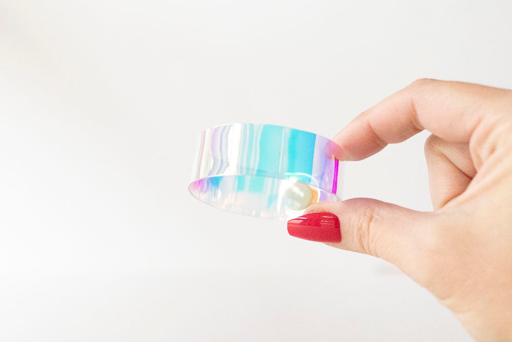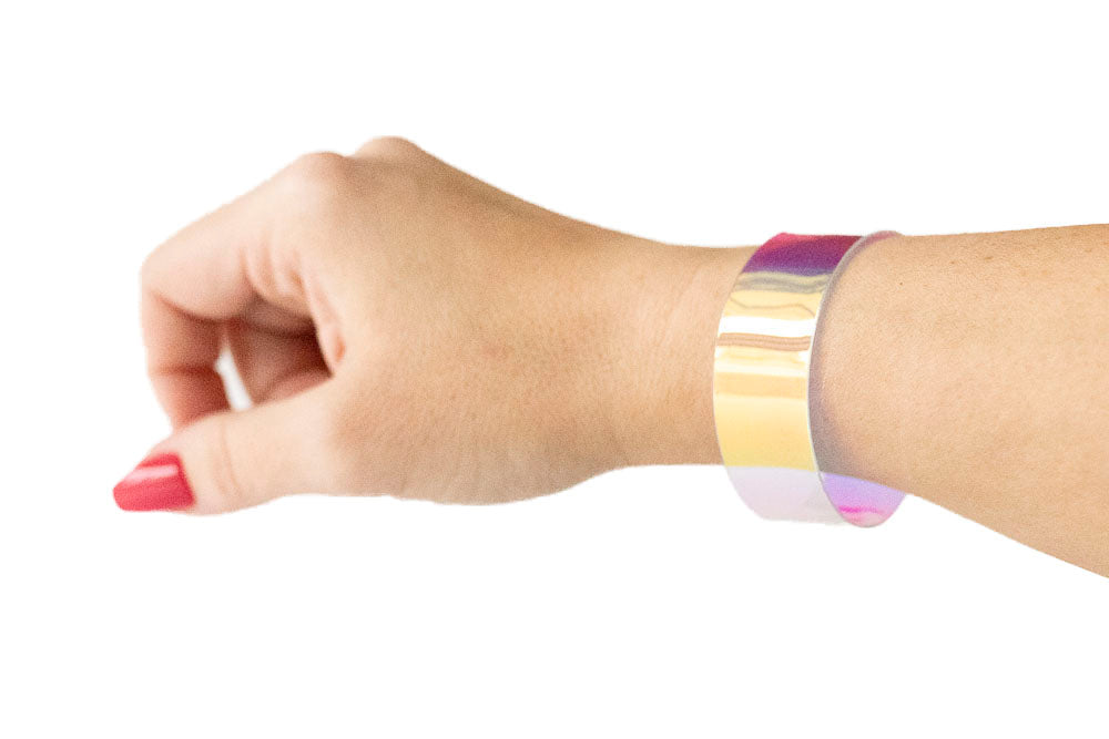 This sophisticated jelly cuff is the perfect piece to up your accessory game. The wider slim cuff design makes it the perfect subtle statement, and it can be worn alone or stacked with other pieces for an eye-catching look. Crafted with 100% genuine jelly vinyl.