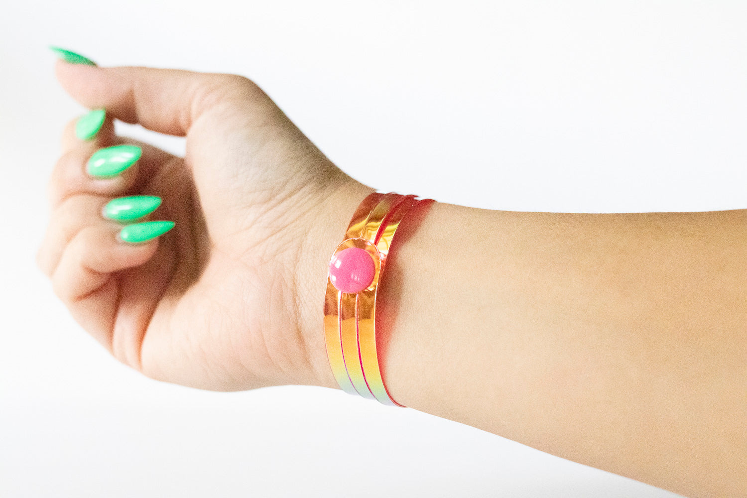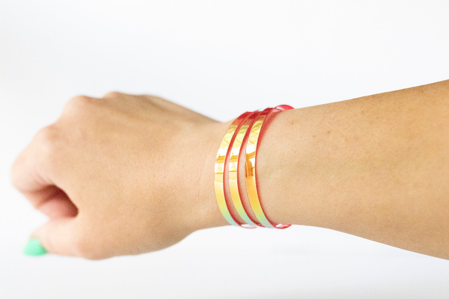 This stylish ultra-skinny sliced cuff bracelet brings a fashionable edge to your stack. Crafted from high-quality jelly vinyl, it's slim design adds a subtle nuance to your everyday look. Enjoy a cute and versatile bracelet without compromising comfort or quality.