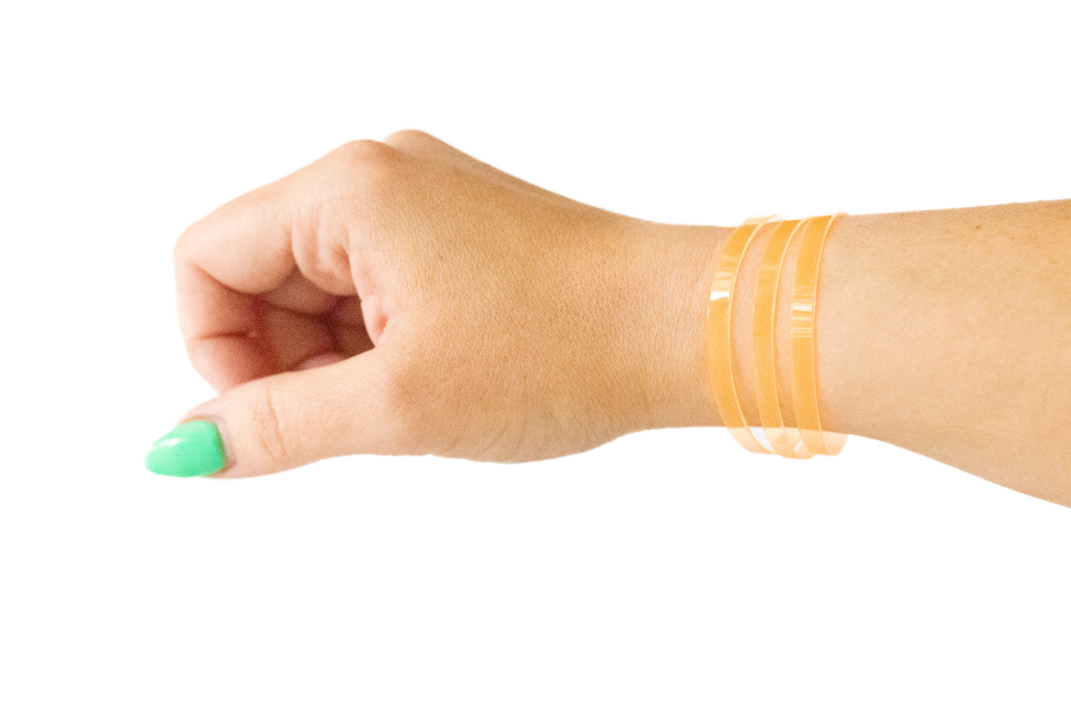 This stylish ultra-skinny sliced cuff bracelet brings a fashionable edge to your stack. Crafted from high-quality jelly vinyl, it's slim design adds a subtle nuance to your everyday look. Enjoy a cute and versatile bracelet without compromising comfort or quality.