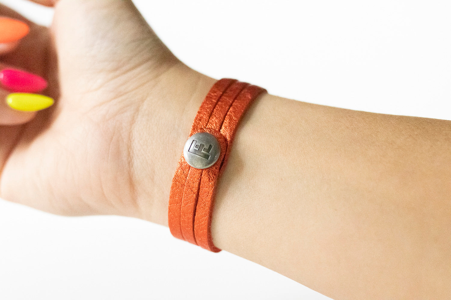 These bracelets will come with a brushed silver FL (Flourish Leather) logo snap.