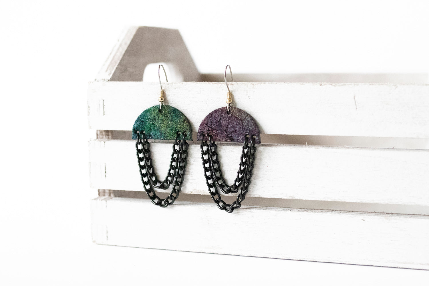 Leather Earrings / Black Chain Drop / Nebula Cloud