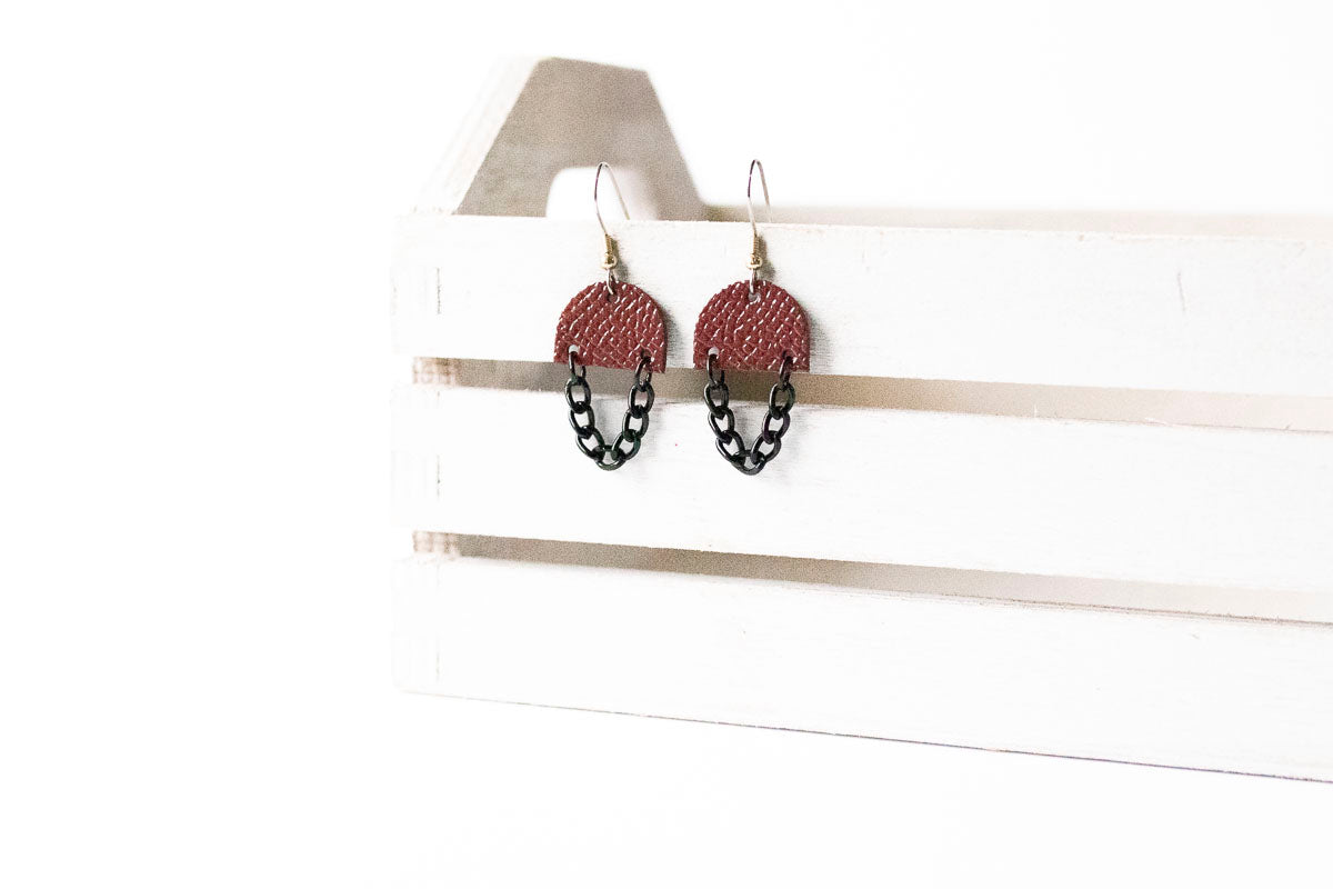 Leather Earrings / Black Mini Chain Drop / Cherry Sage