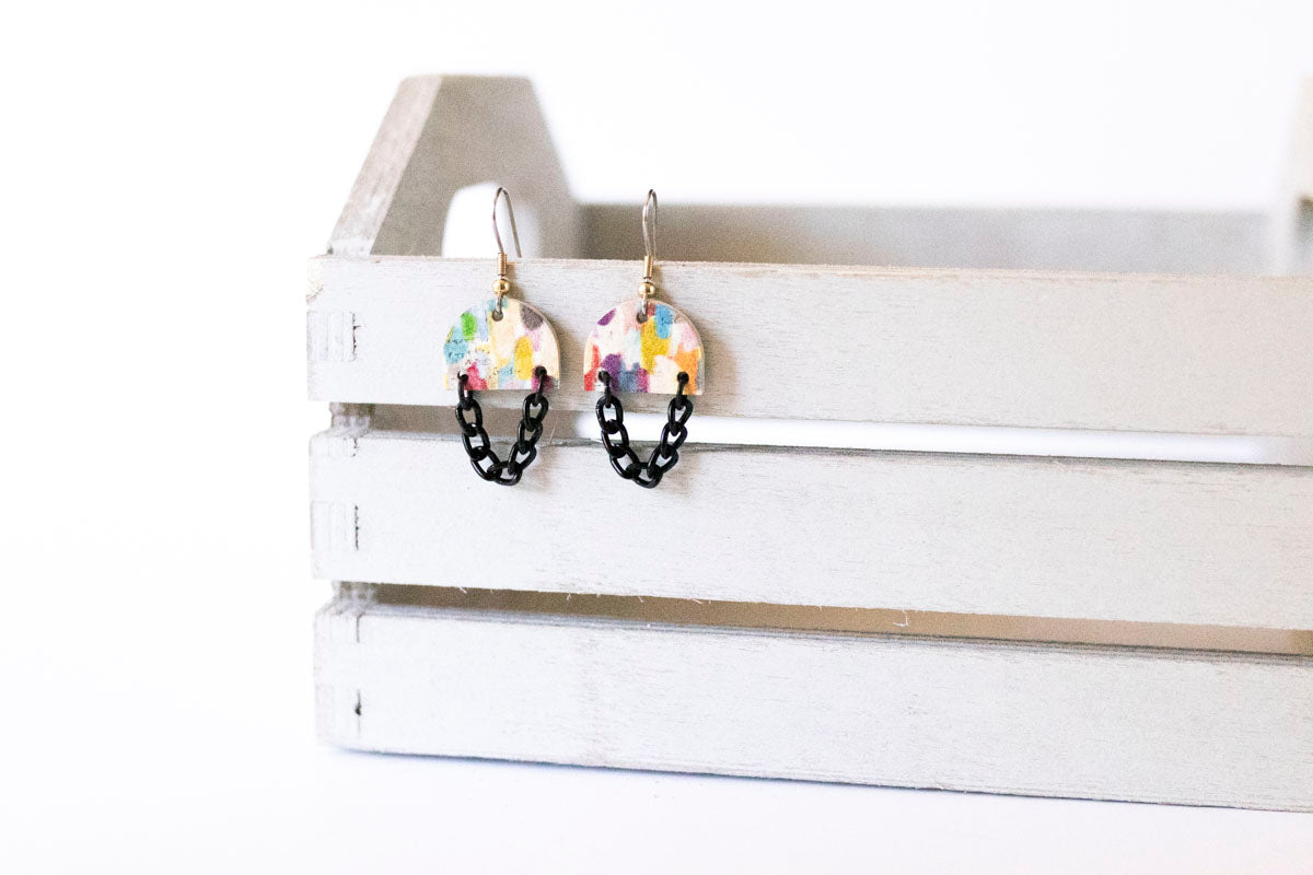 Leather Earrings / Black Mini Chain Drop / Painted Waters Cork