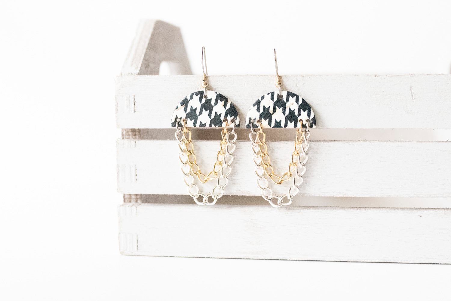 Leather Earrings / Chain Drop / Houndstooth Cork