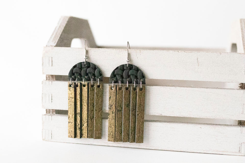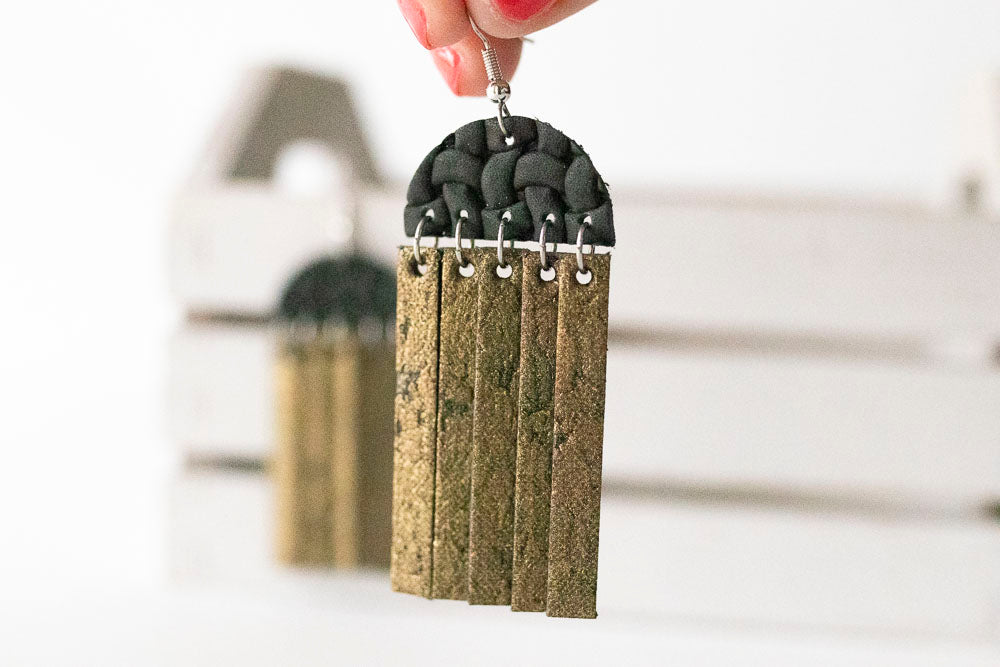 These eye-catching leather earrings are a twist from our original Cinque Luci. Crafted from premium leather, they feature a bold chandelier design with five lights - in Italian, "cinque luci" - and a striking two-tone finish. Add some style to any outfit with these unique earrings. We took the original and added some length for an XL statement piece you will love.