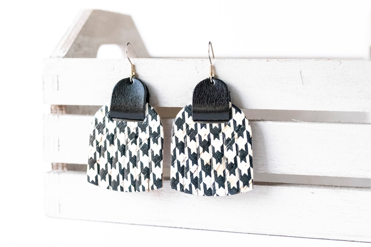 Leather Earrings / Fringies / Houndstooth Cork & Metallic Black