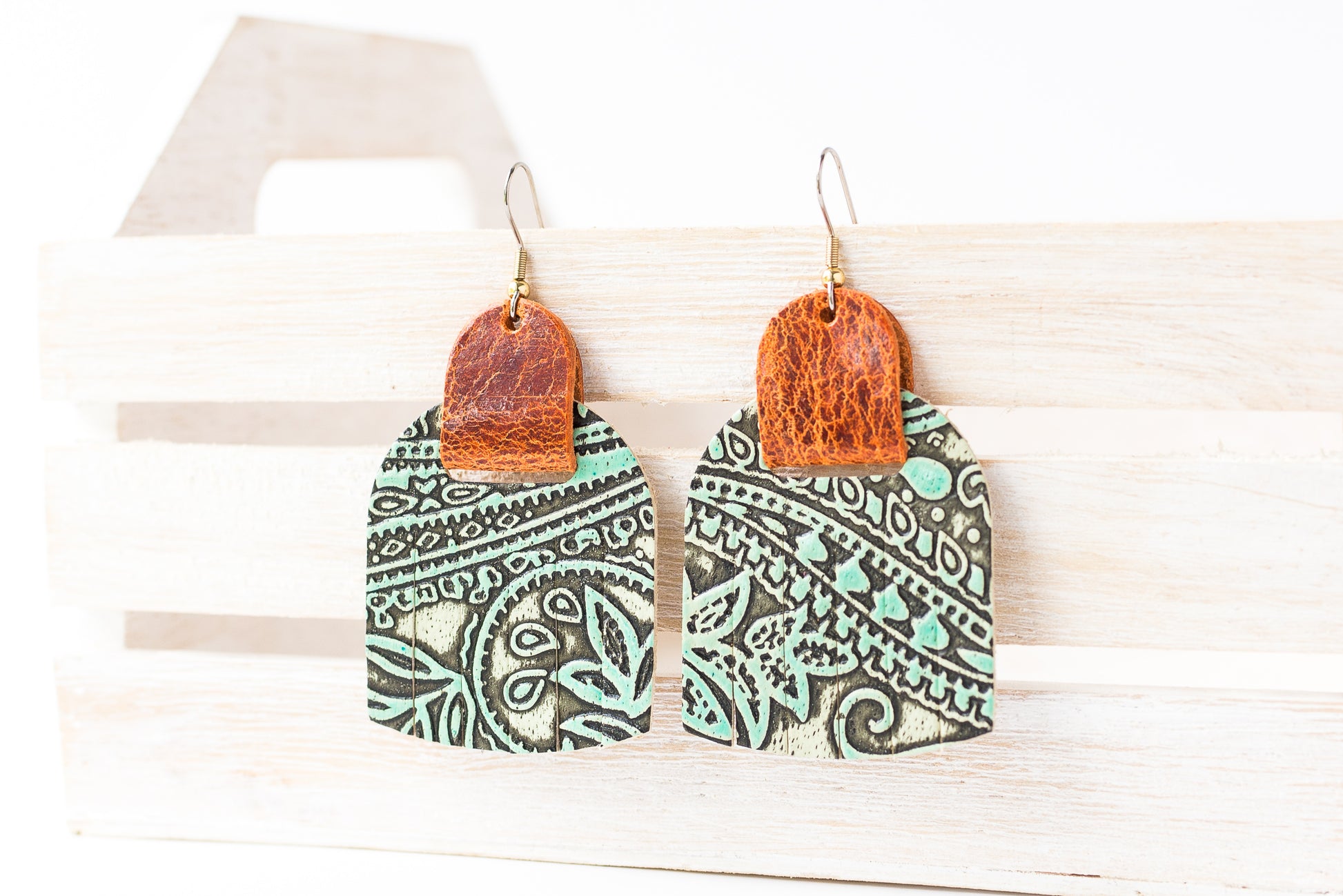 Leather Earrings / Fringies / Paisley Turquoise & Vintage Brown