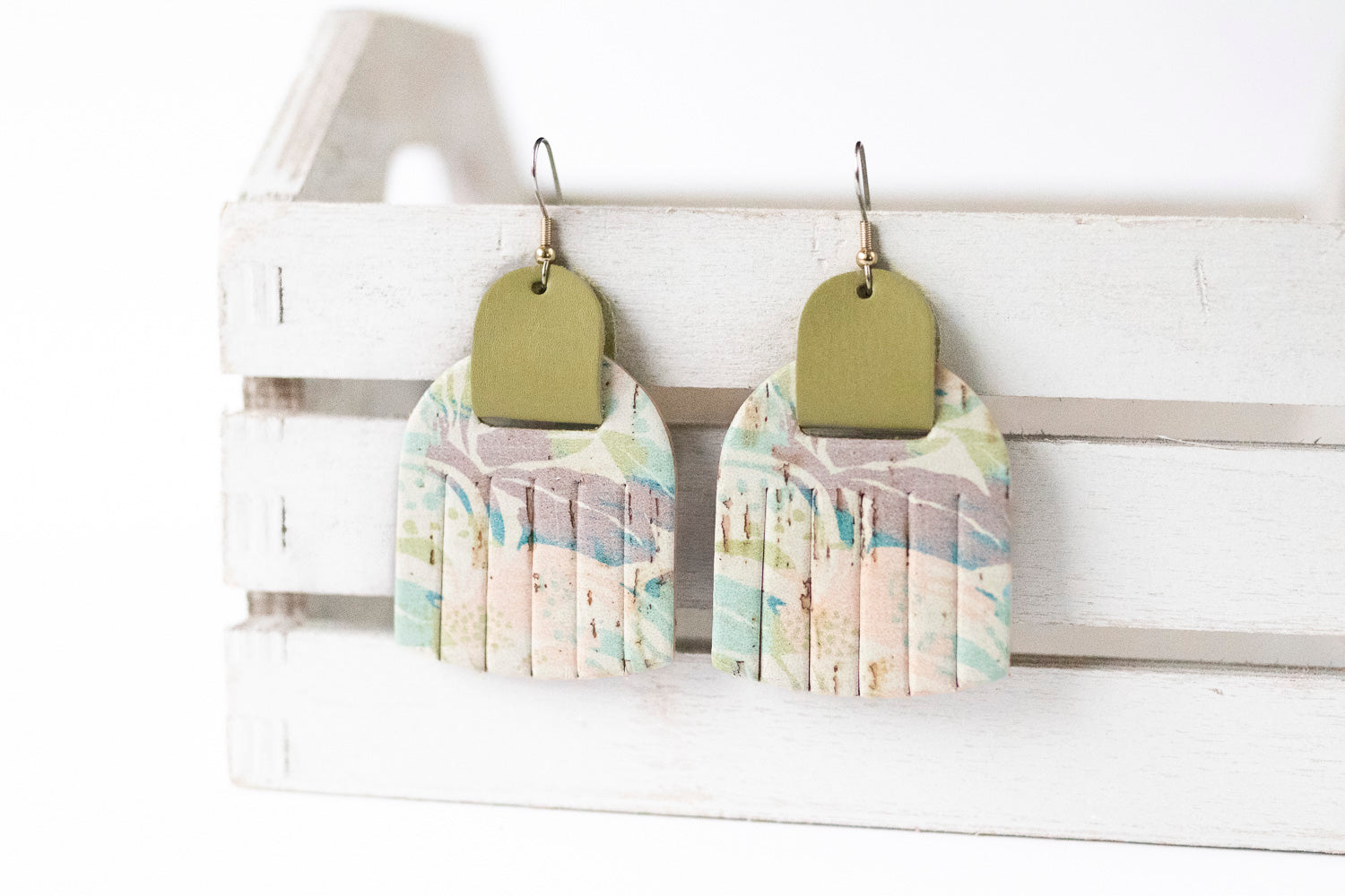 Leather Earrings / Fringies / Retro Palms Cork & Green Tea
