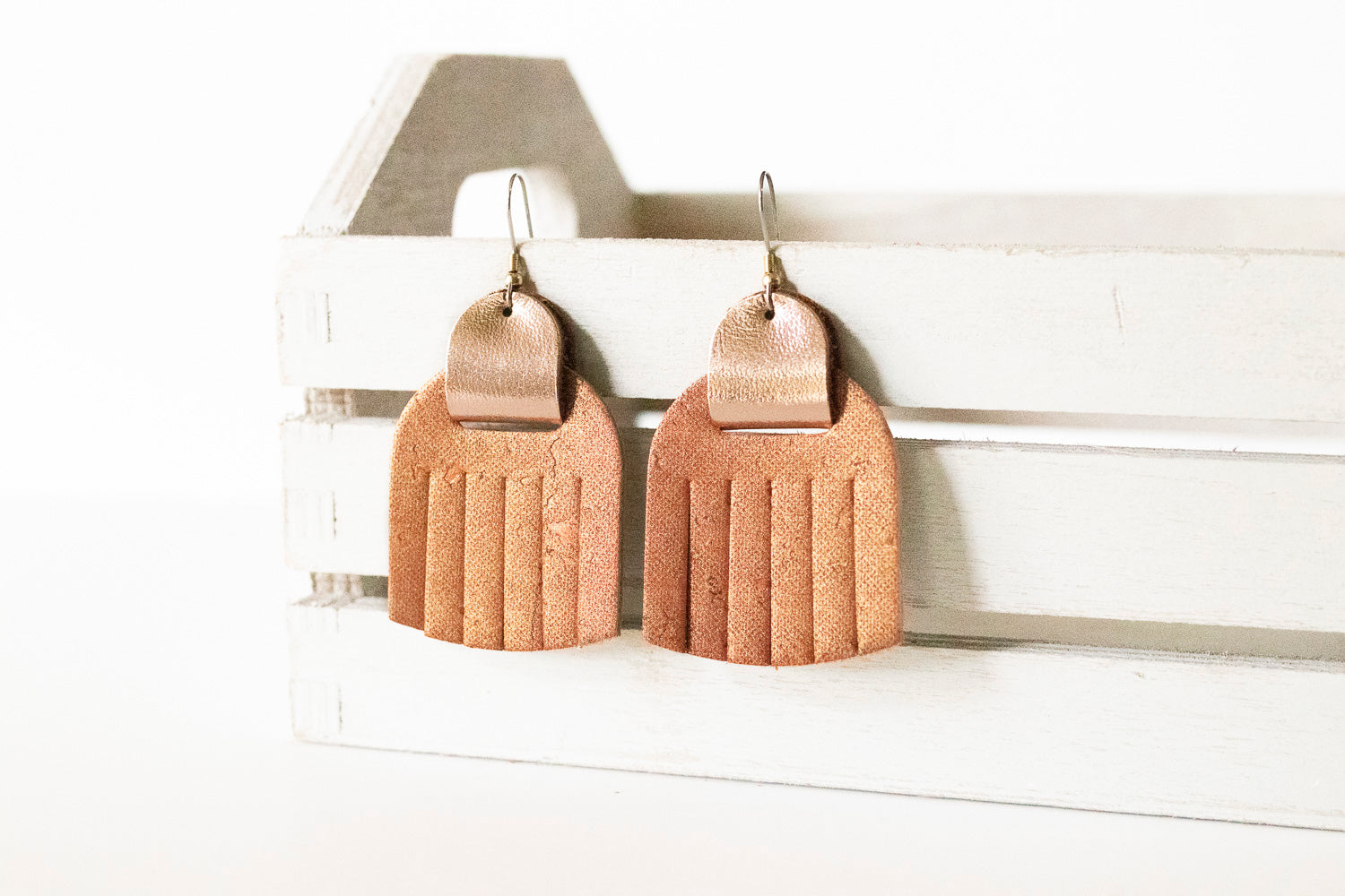 Leather Earrings / Fringies / Spiced Cider Cork & Metallic Rosegold