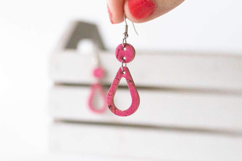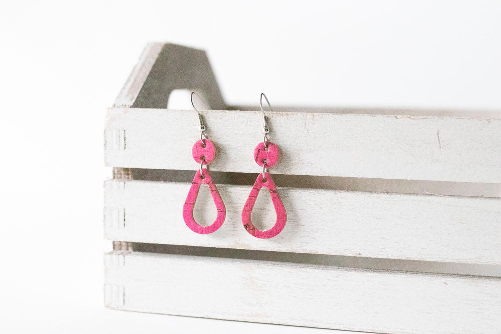 Leather Earrings / Hollow Droplets / Electric Pink Cork
