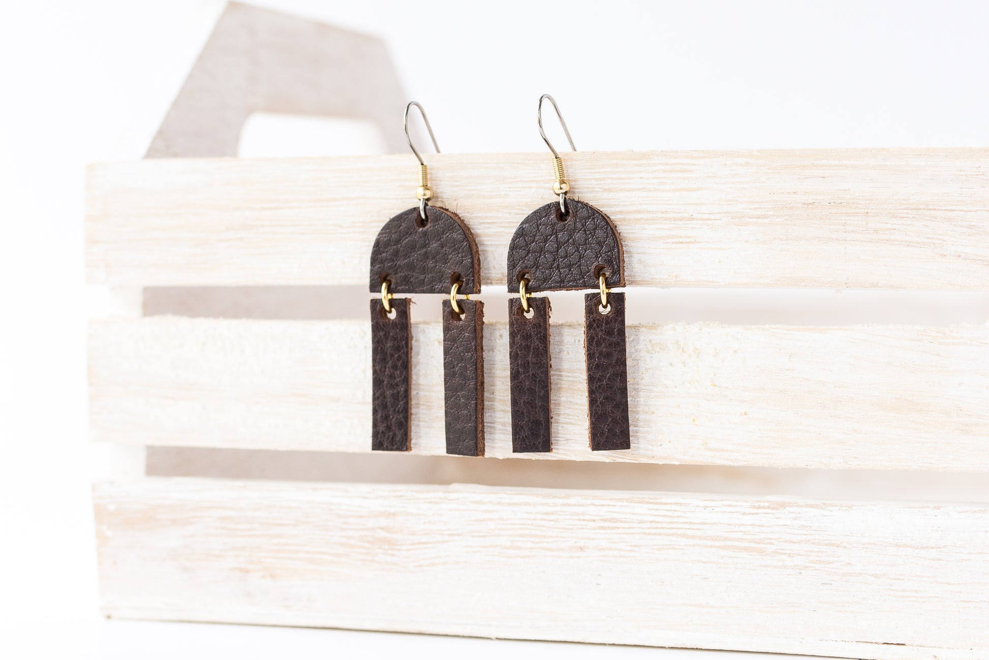 These striking geometric earrings combine a unique 3-piece design with leather to make a beautiful statement!