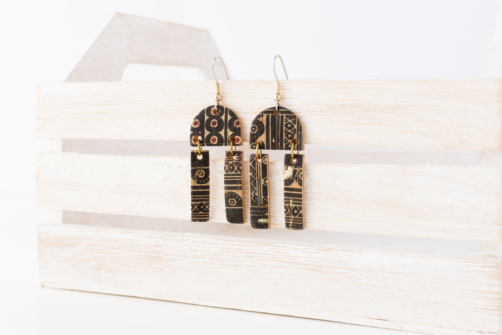 These striking geometric earrings combine a unique 3-piece design with leather to make a beautiful statement!