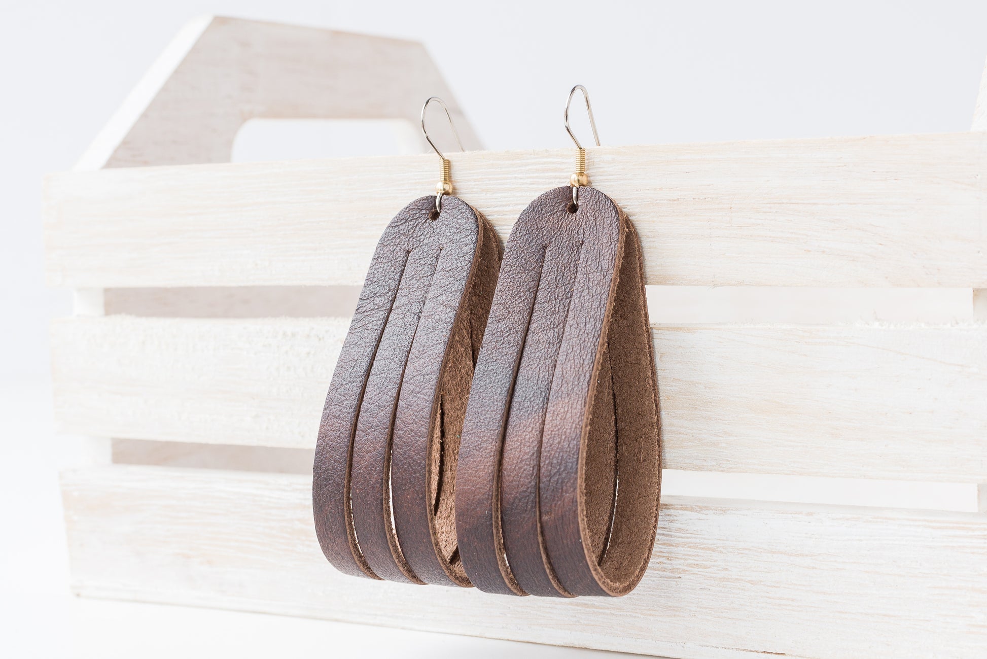 Leather Earrings / Sliced Leather / Washed Dark Brown