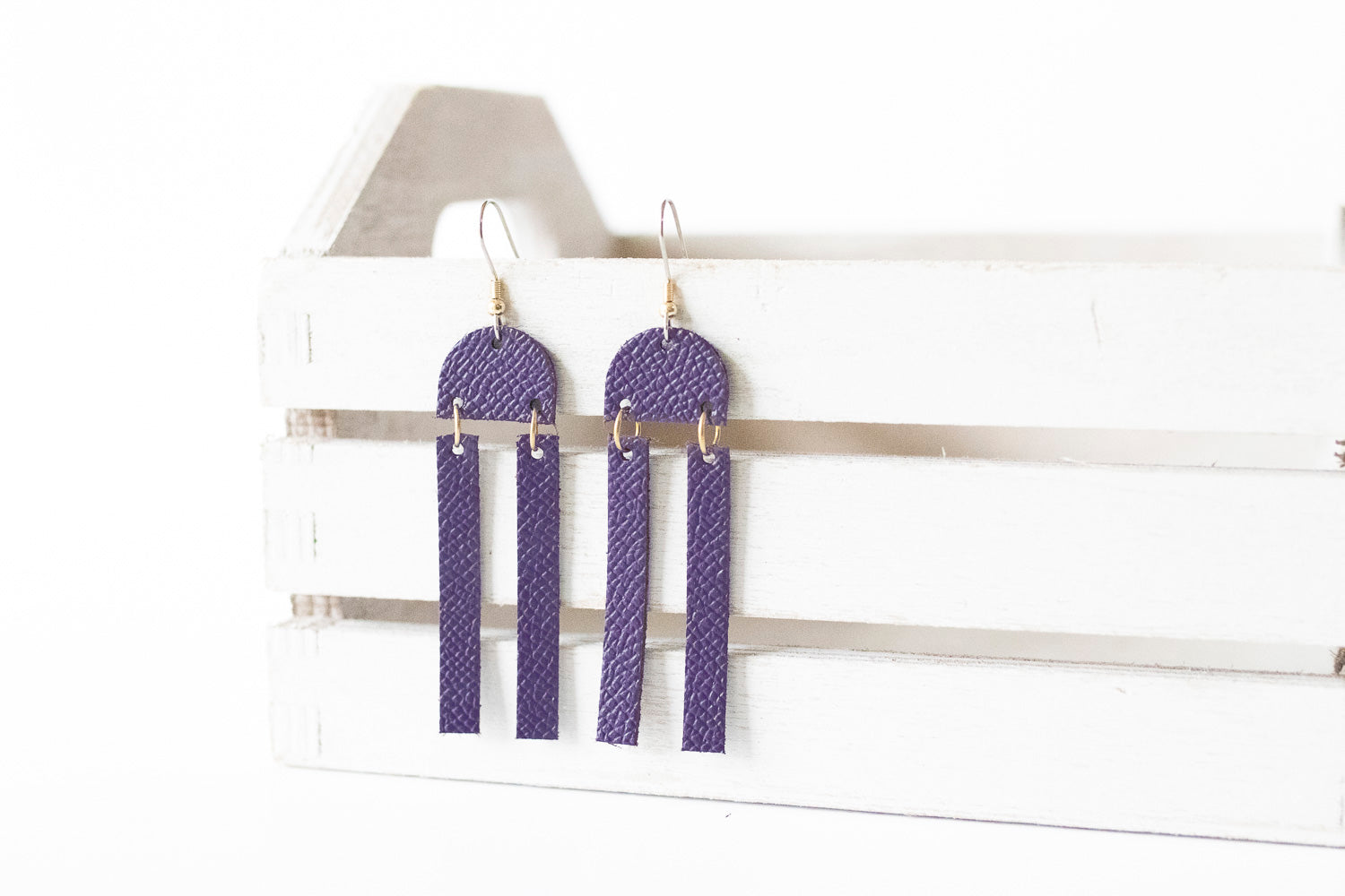 These striking geometric earrings combine a unique 3-piece design with leather to make a beautiful statement!