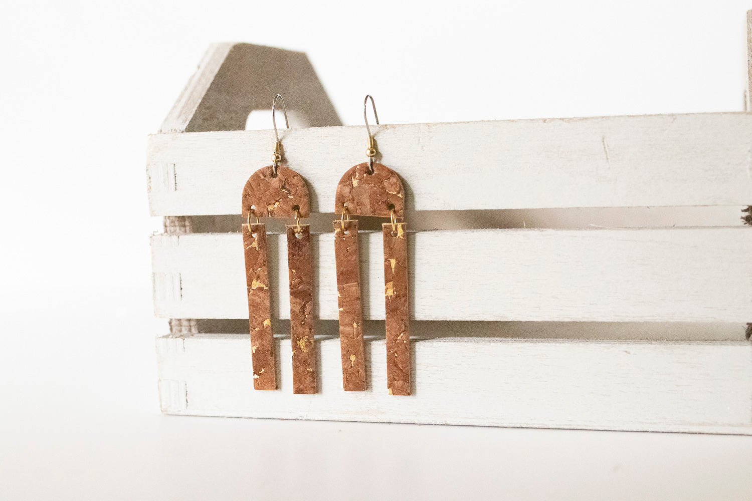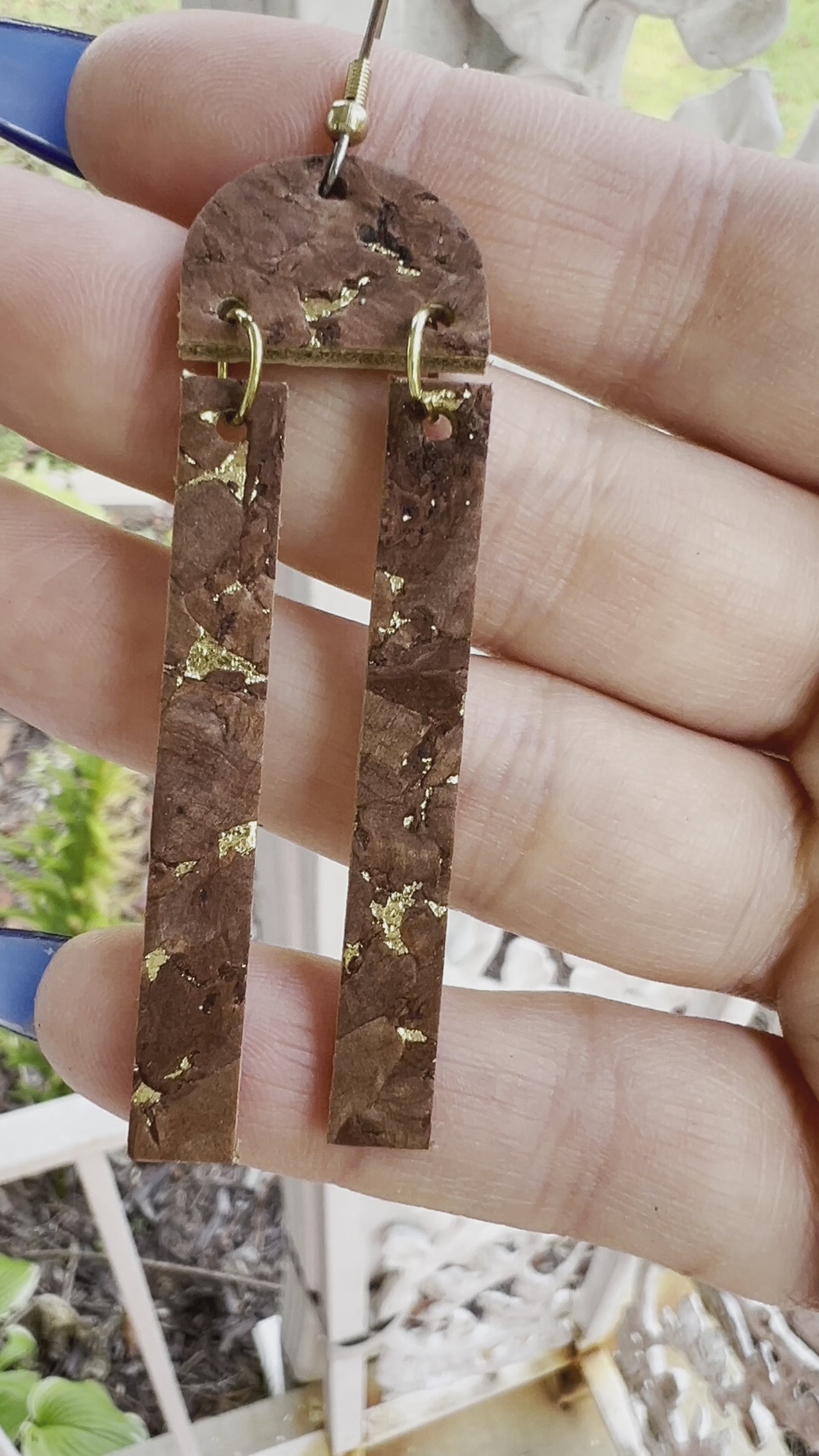 These striking geometric earrings combine a unique 3-piece design with leather to make a beautiful statement!