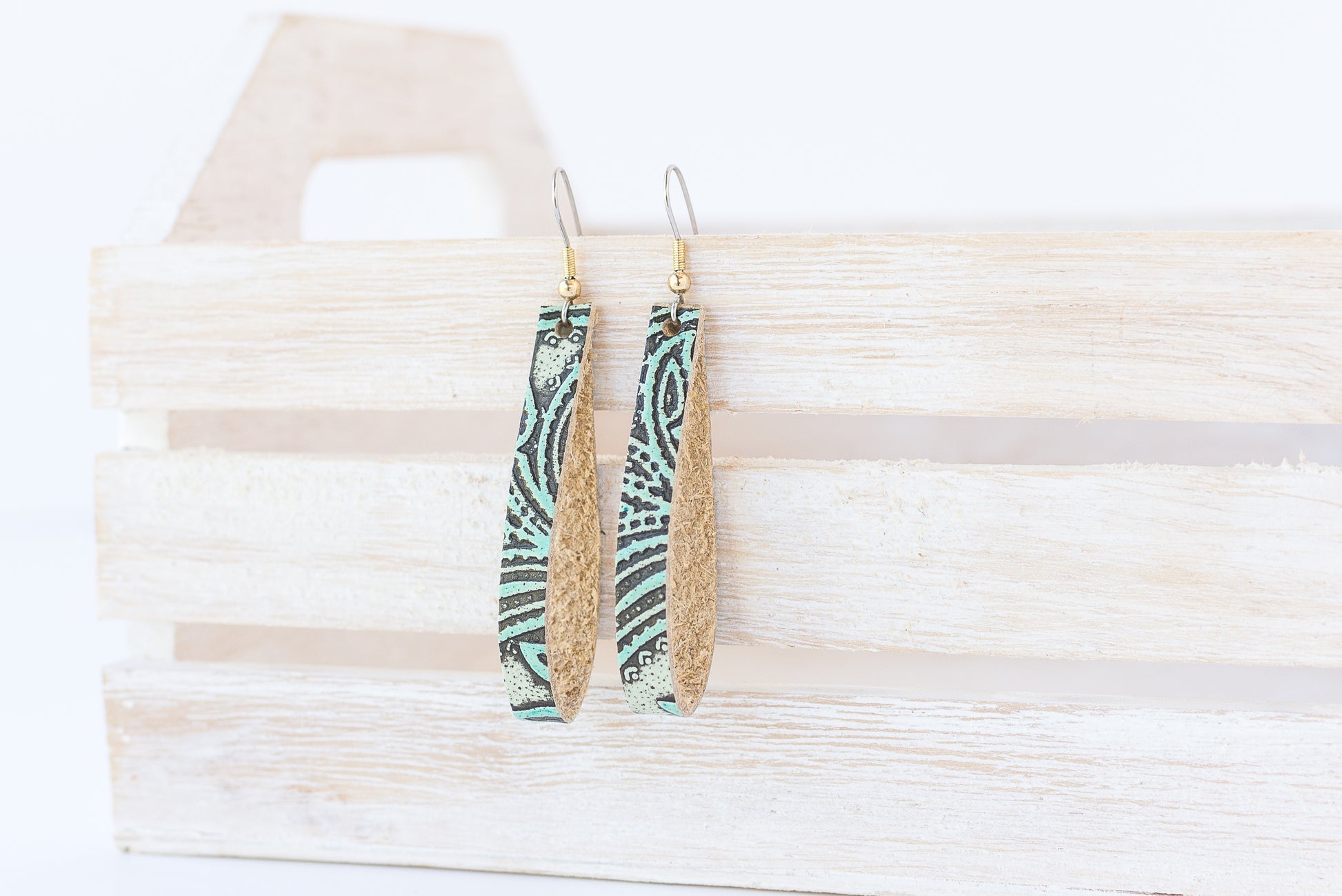 Leather Earrings / Thin Slit / Paisley Turquoise