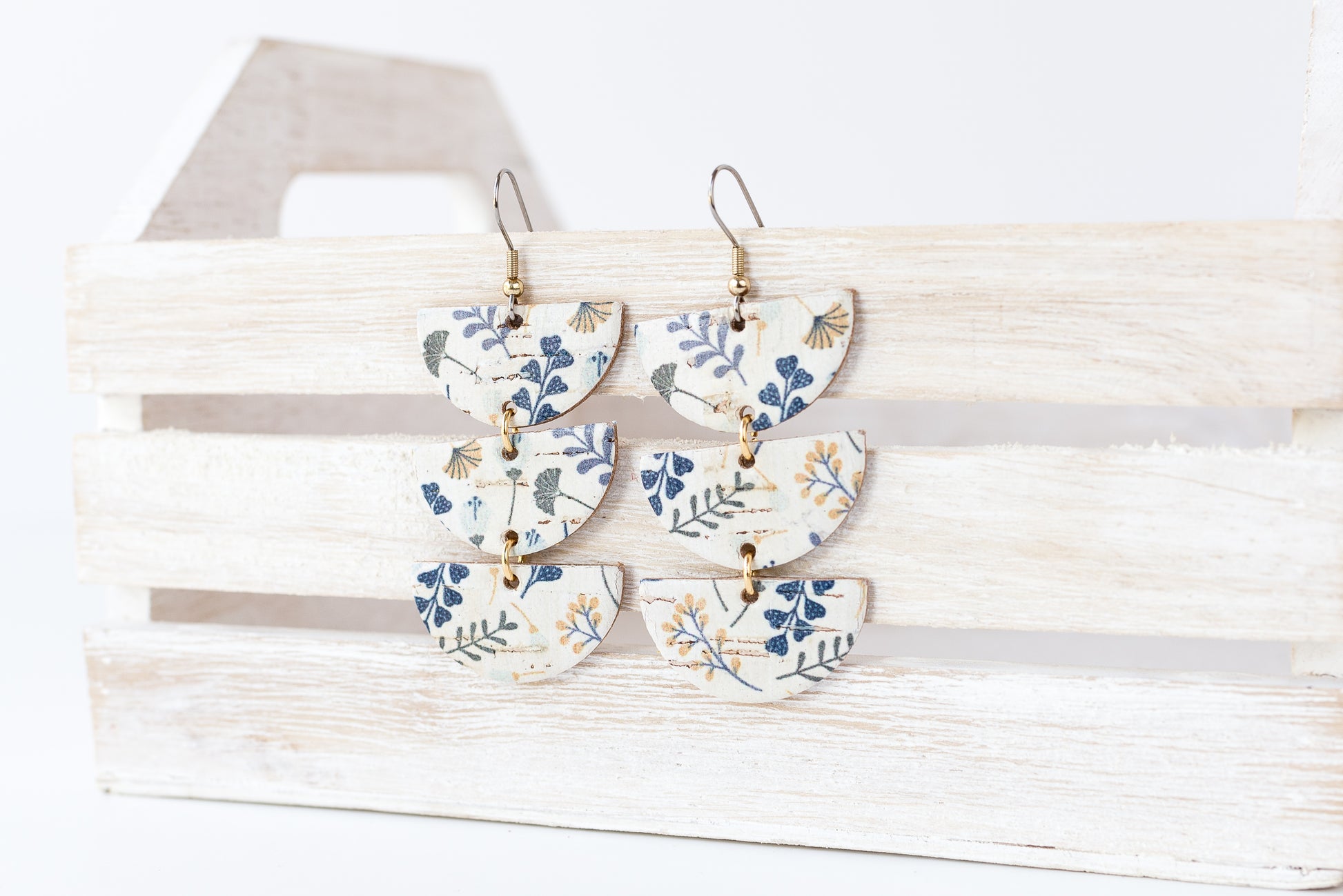 Leather Earrings / Tri Luna / Cottage Floral Cork