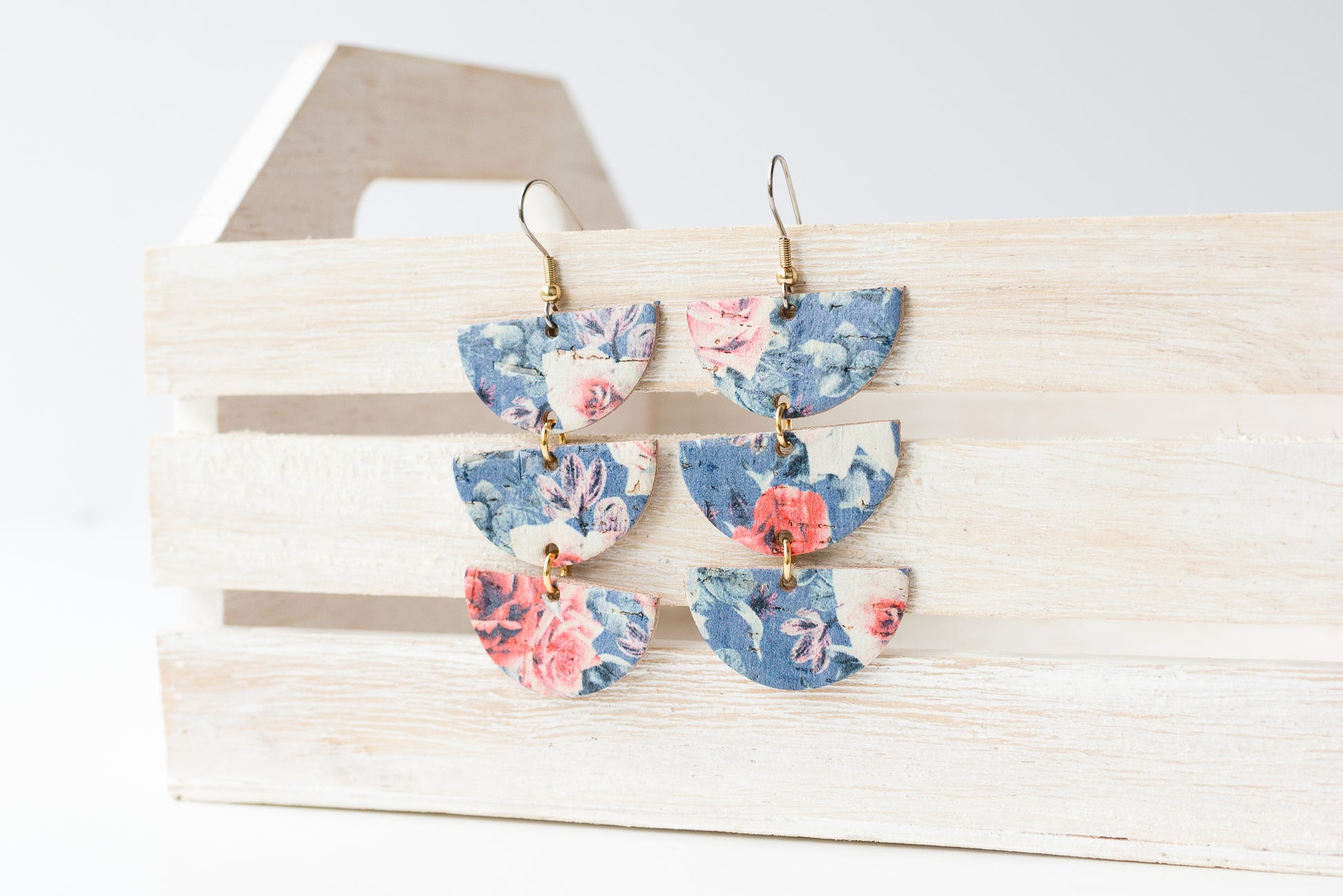Leather Earrings / Tri Luna / Pink Roses Cork
